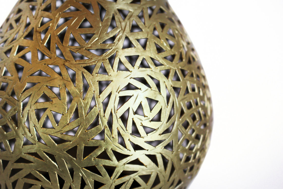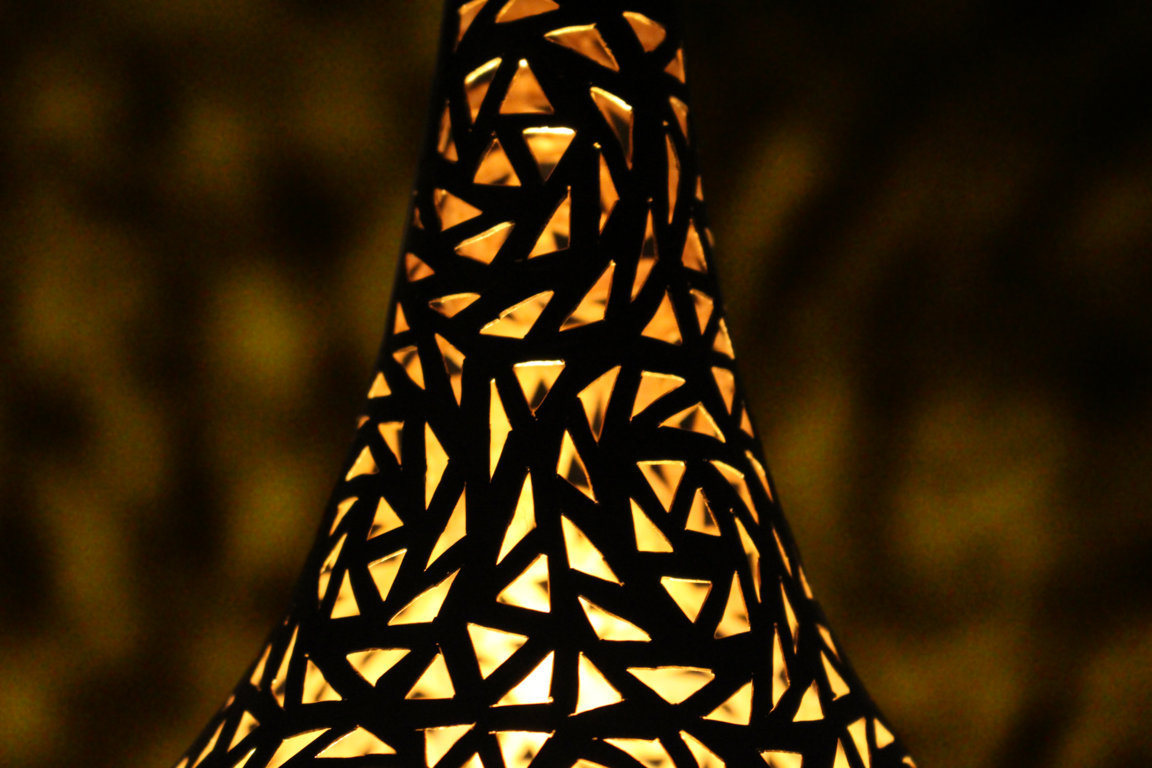 Diese tropfenförmige Stehlampe aus massiven Messing ist ideal als Ambiente Element für den Wohnraum oder den Balkon. Das traditionelle Muster vereint einen absolut modernen und zeitlosen Look mit der Kunst eines alten, orientalischen Kunsthandwerks. Die Oberfläche wurde mit einer speziellen Patina behandelt, um einen schönem Antikeffekt zu erhalten.