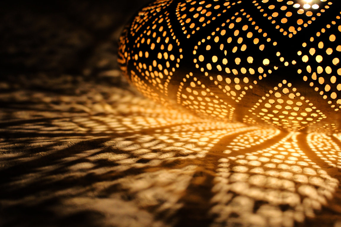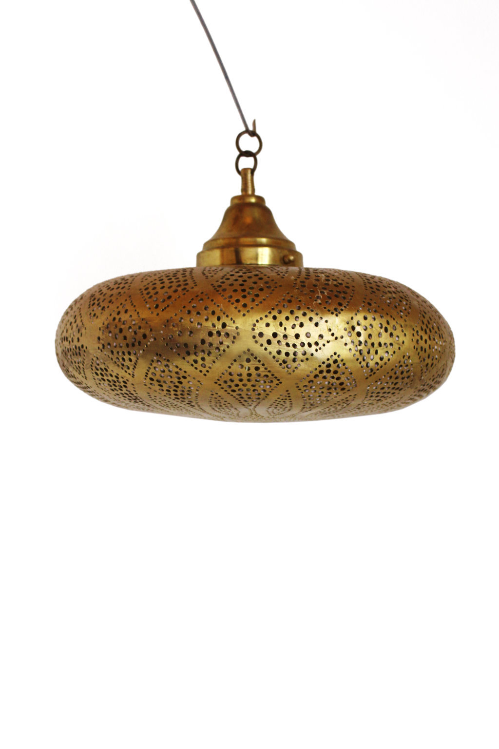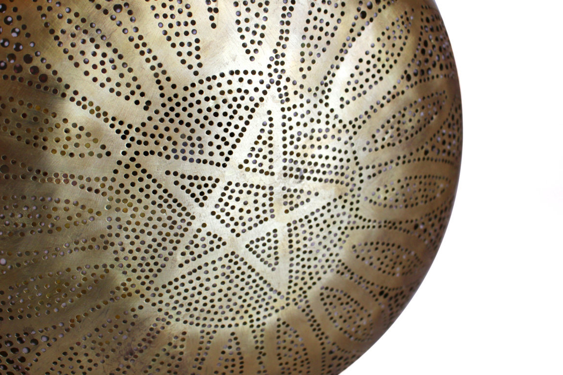 Zauberhafte Beleuchtung strahlt die Hängeleuchte Assia aus ihrem Messing Metallschirm heraus. Mit filigrane Sägearbeit wurde der oval geformte Schirm der Leuchte gestaltet. Die kleinen Öffnungen lassen das Licht des Leuchtmittels hinausleuchten, so dass neben einer behaglichen Beleuchtung schöne Schattenspiele in der Umgebung entstehen. Die goldfarbene Oberfläche des Messings wurde mit einer speziellen Patina behandelt, um einen wunderschönen Antikeffekt zu erzielen.