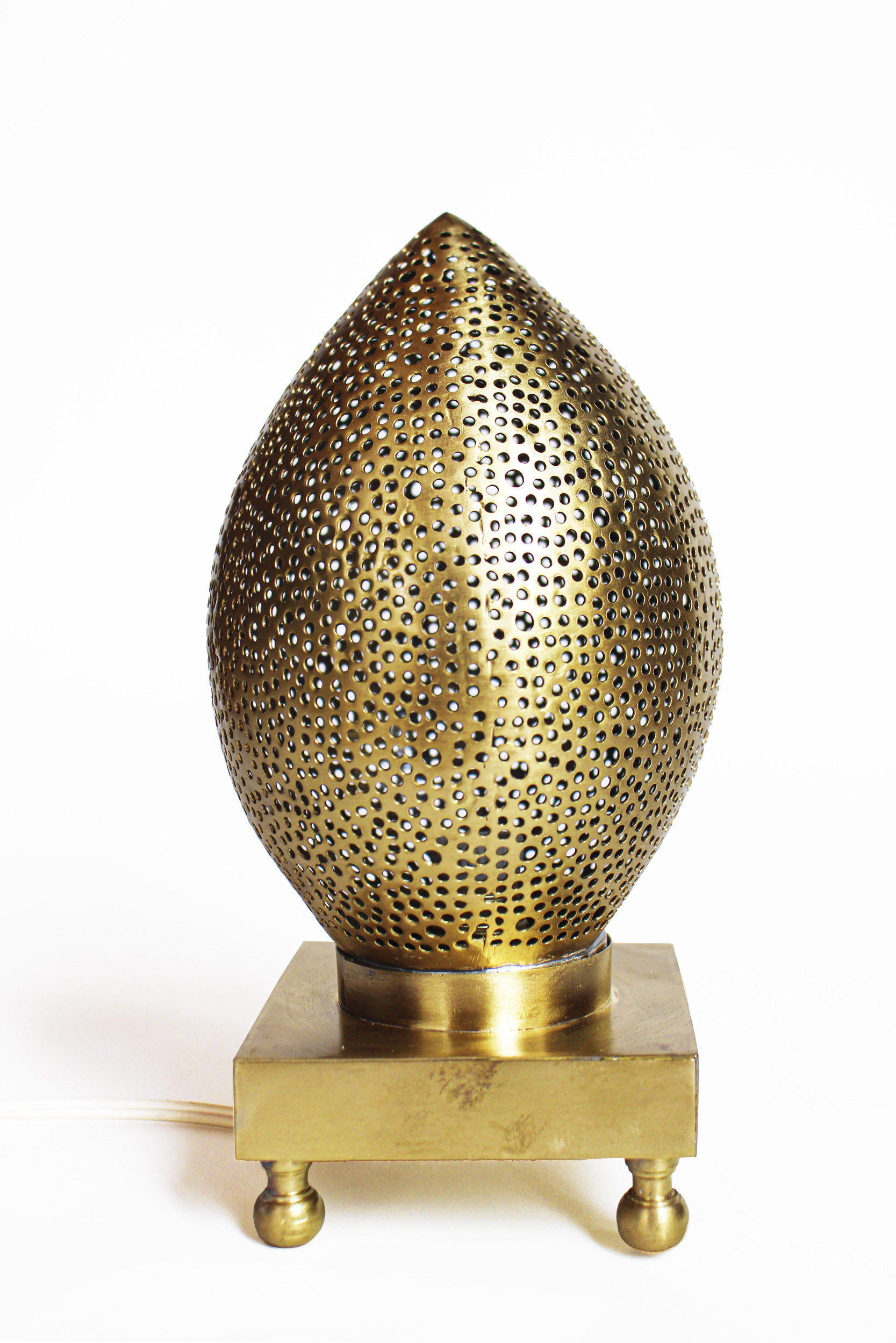 Diese tropfenförmige Stehlampe aus massiven Messing ist ideal als Ambiente Element für den Wohnraum oder den Balkon. Das Muster vereint einen absolut modernen und zeitlosen Look mit der Kunst eines alten, orientalischen Kunsthandwerks. Die Oberfläche wurde mit einer speziellen Patina behandelt, um einen schönem Antikeffekt zu erhalten.