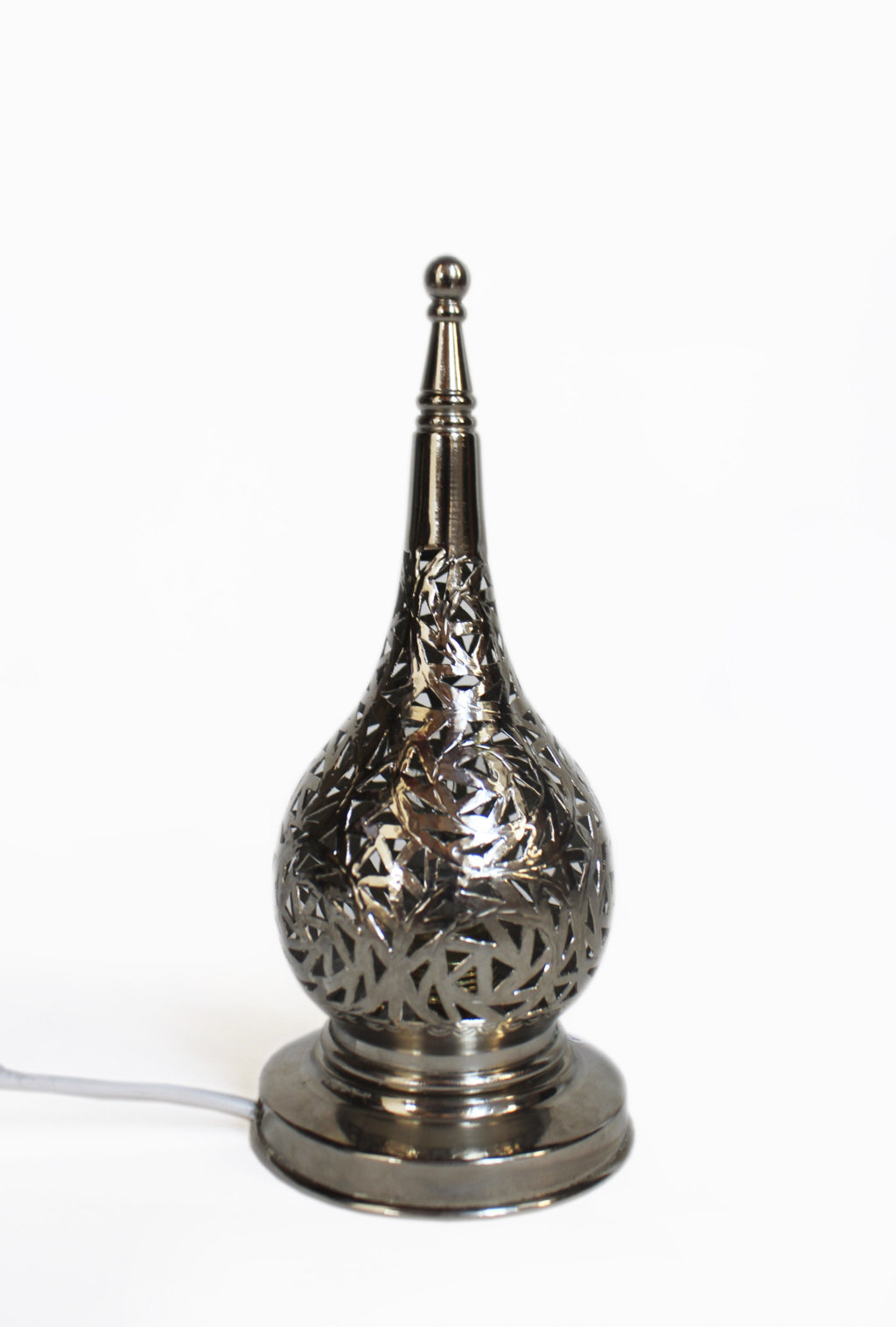 Diese tropfenförmige Stehlampe aus massiven Messing ist ideal als Ambiente Element für den Wohnraum oder den Balkon. Das Muster vereint einen absolut zeitlosen Look mit der Kunst eines alten, orientalischen Kunsthandwerks. Die Oberfläche wurde mit einer speziellen Patina versilbert.