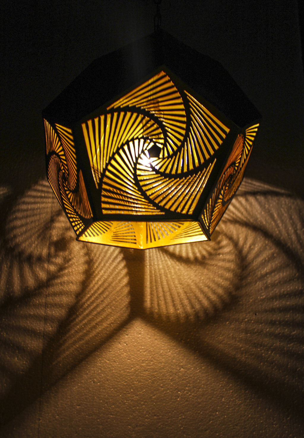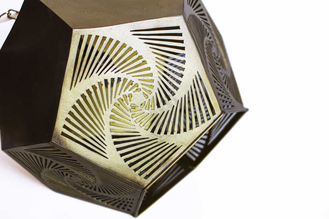 Die Hängeleuchte Yamina strahlt zauberhafte Beleuchtung aus ihrem Messing Metallschirm heraus. Der kantige Schirm der Leuchte wurde mit handgebohrte Löcher gestaltet. Die kleinen Öffnungen lassen das Licht des Leuchtmittels hinausleuchten, so dass neben einer behaglichen Beleuchtung schöne Schattenspiele in der Umgebung entstehen. Die goldfarbene Oberfläche des Messings wurde mit einer speziellen Patina behandelt, um einen wunderschönen Antikeffekt zu erzielen.