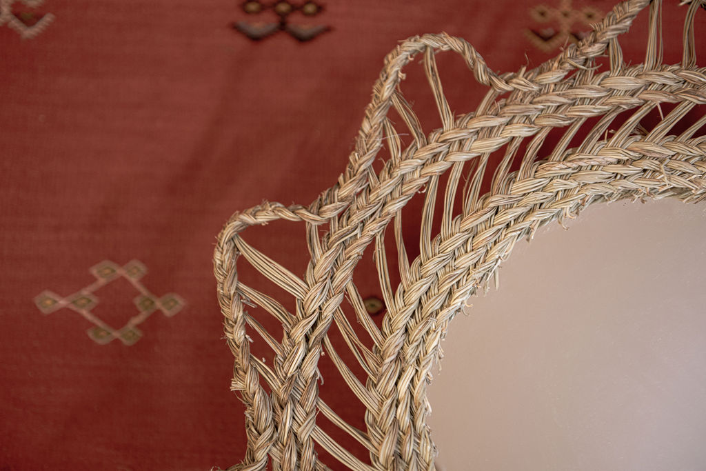 Unser Spiegel Ouarzazate aus Palmblätter wurde traditionell von Hand geflochten. Ein echtes Handwerksprodukt, ideal als Ambiente Element für jeden Boho Style Wohnraum.